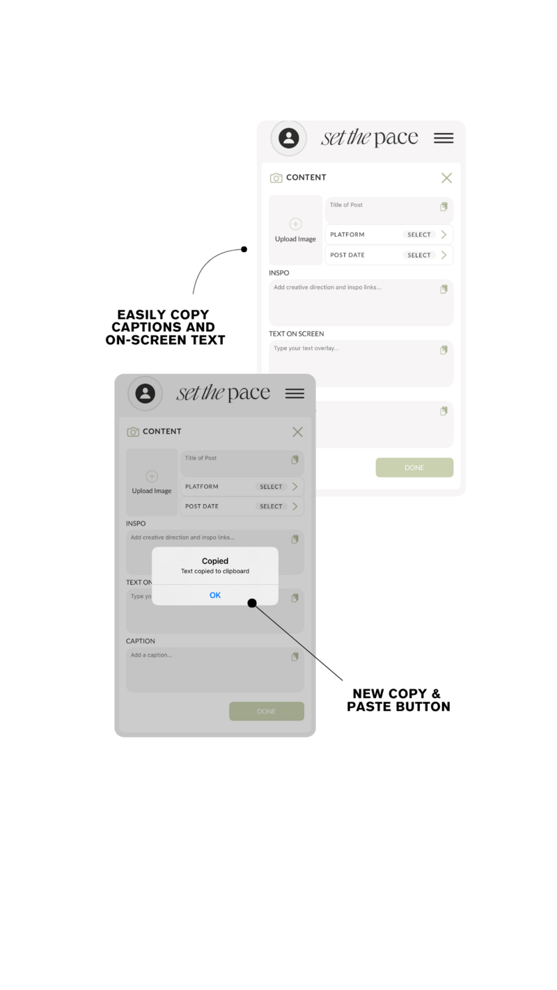 No more searching through notes or retyping your ideas. With STP’s new Copy & Paste button, you can easily grab your saved captions or on-screen text and drop them straight into your next post. Fast, simple, and totally seamless — just the way content creation should be.