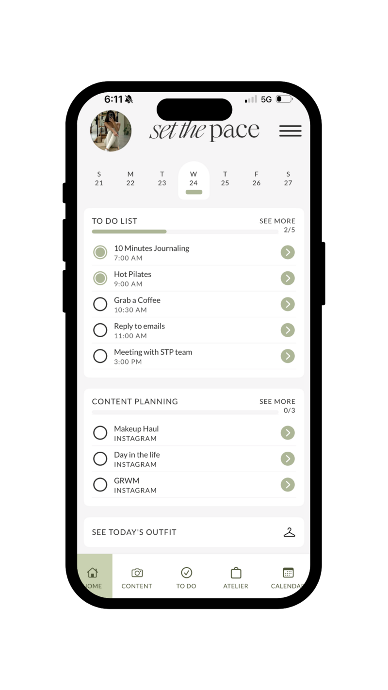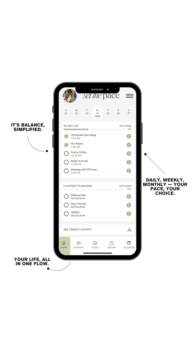 See your whole week at a glance — to-dos, content, wellness goals, and more. The STP homepage keeps everything beautifully organized in one calm view, so you can start each day feeling clear, centered, and in control.